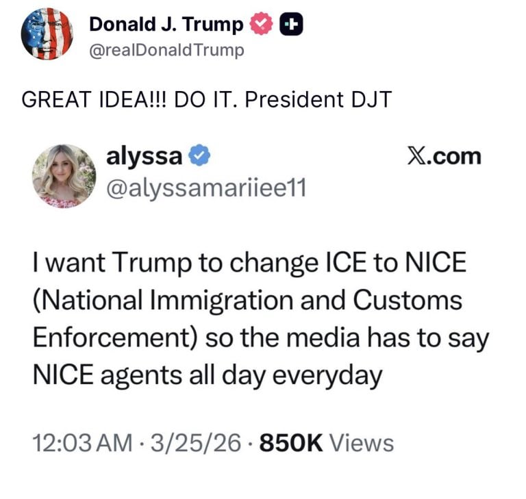 Gần đây, một số người trên mạng đã đưa ra ý tưởng đổi tên ICE (Cơ quan Thực thi Di trú và Hải quan) thành NICE (Cơ quan Thực thi Di trú và Hải quan Quốc gia)(Immigration and Customs Enforcement) to NICE (National Immigration and Customs Enforcement).