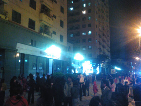 Hàng trăm người, lớn bé, già trẻ tranh nhau chạy xuống bằng cầu thang bộ, trên tay không quên vác theo những đồ quan trọng. Đám trẻ con được bố mẹ bế sơ tán khẩn xuống dưới chân tòa nhà cũng hoảng sợ kêu khóc gây nhốn nháo cả khu đô thị.