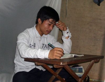 Nhã, sinh viên Ðại Học Bách Khoa Ðà Nẵng, thường thức đến 3 giờ sáng để học bài và dậy lúc 6 giờ sáng để đi học. Khoảng thời gian từ 5 giờ chiều đến 11 giờ đêm phải đi phụ giữ xe để kiếm tiền trang trải. (Hình: Phi Khanh/Người Việt)
