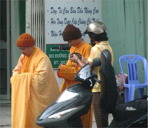 6h30 phút, dòng người đông đảo trên đường 3/2, ai cũng phải để mắt tới hình ảnh hai vị “sư” tội nghiệp, vẻ mặt trang nghiêm và đầy khổ hạnh, đi từng bước một, miệng lẩm bẩm đọc kinh. Quá quen thuộc, người dân hai bên đường, cô bán nước… khi thấy hai “sư” đi qua đều mang những đồng tiền lẻ bỏ vào bát đựng tiền và khấn lạy như muốn cầu mong may mắn tới mình trong ngày mới.