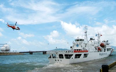 Trong tấm hình này, Haixun-31, tàu tuần biển lớn nhất, hiện đại nhất của Trung Quốc trang bị trực thăng rời cảng Chu Hải của tỉnh Quảng Ðông. Tiếng là đi thăm viếng Singapore từ ngày 15 tháng 6, 2011 nhưng dư luận báo chí quốc tế tin rằng nhiệm vụ chính của chuyến đi này là nhằm đe dọa các nước trung khu vực khi cuộc tranh chấp biển đảo trên biển Ðông ngày một căng thẳng. (Hình: AP photo/Xinhua)