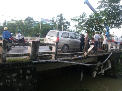 Đâm nát thành cầu,xe ô tô “treo” lơ lửng