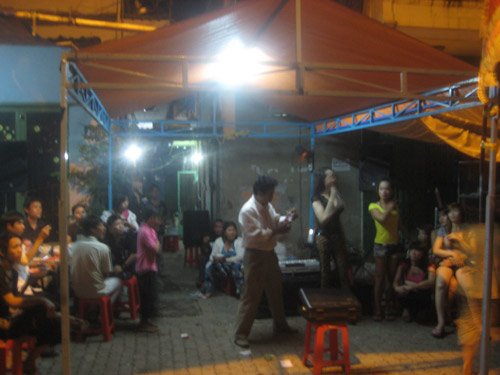 Tôi thực sự đau mắt khi một thanh niên xem chừng tuổi chưa qua hai mươi, khi thấy "nàng" ca sĩ ăn mặc hở hang đi ngang qua, lấy tay, kéo lại, nhét một tờ polime sâu vào quần với nụ cười mãn nguyện. "Cô" ca sĩ xoay lại mắng: "Yêu ghét anh này ghê a". Nhiều trẻ em ngồi xem, thấy người lớn cười cũng cười sặc sụa. Thật không thể diễn tả hết được sự nhơ nhớp tại... "sân khấu nhà đám" này. Một thanh niên ra vẻ kinh nghiệm cho biết buổi trình diễn này càng về khuya sẽ càng hấp dẫn với những tiết mục hấp dẫn, thoát y. Chỉ khi nào mọi người không bo tiền nữa thì mới chấm dứt, không thì diễn cho đến sáng.