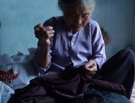 Bà Thắng đang mày mò vá từng mảnh áo do cô con gái xé rách