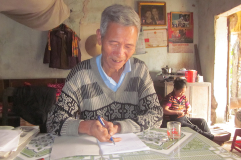 Người ta thường nói, trời không lấy không của ai cái ǵ bao giờ, được cái này th́ mất cái nọ. Ông thiếu đi 8 ngón tay, 6 ngón chân nhưng bù lại ông có nghị lực phi thường, được nhiều người quư mến bằng rất nhiều tài lẻ. Ông kể trong sự hồ hởi về thành tích viết chữ đẹp, ông đă từng viết bằng khen, giấy khen khi c̣n đang đi học cũng như trong quá tŕnh công tác sau này. Không chỉ có vậy, con số 230 là con số các đám cưới cho đến nay mà ông đă từng kẻ vẽ, cắt chữ trên phông bạt. Ông chỉ lên bức ảnh cưới của ông với người vợ đầu tiên treo trên tường. Bức ảnh rất có hồn do ông vẽ bằng sơn dầu để kỷ niệm ngày cưới khiến chúng tôi càng thêm cảm phục một con người như ông.