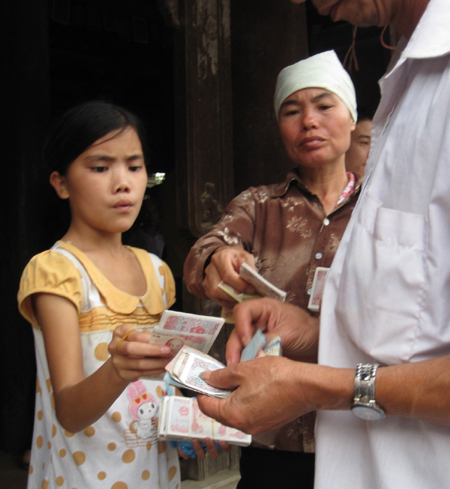 Mặc dù không có tiền mặt trong tay nhưng, anh Hỡi vẫn đọc vanh vách các mức lệ phí đổi tiền lẻ mới: "Thế này em à, tiền lẻ, mới có mệnh giá 200 VNĐ đổi với số lượng trên 2 triệu đồng th́ phí là 55%. Tiền mệnh giá 500 VNĐ số lượng trên 5 triệu đồng th́ khách hàng phải chịu phí 25%. Tiền mệnh giá 1000, 2000, 5000, 10.000, 20.000 đến 100.000 VNĐ th́ có mức phí đổi từ 5 - 16%. Tiền càng có mệnh giá cao th́ phí càng nhỏ".