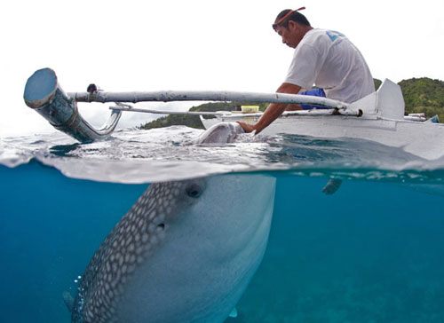 Hình ảnh ngư dân Philippines dùng tay cho cá mập voi ăn