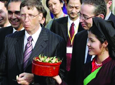 Tỷ phú Mỹ Bill Gates được một liền chị Quan họ mời trầu cánh phượng tại Bắc Ninh năm 2006