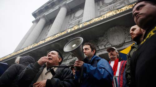 | Ernesto Viscarra (trái) kể chuyện ḿnh bị tịch thu nhà ra sao trong cuộc biểu t́nh phản đối các vụ bán đấu giá nhà bị tịch thu ở bên ngoài ṭa thị chính San Francisco (California, Mỹ) ngày 20-1-2012 - Ảnh: Reuters |