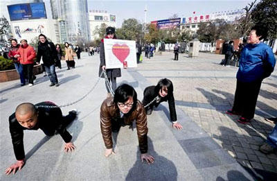 Đeo xích chó, liếm gót giày để... bảo vệ nữ quyền
