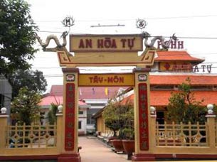 Cổng vào ngôi chùa Phật giáo Ḥa Hảo An Ḥa Tự ở An Giang./Photo courtesy of phatgiaohoahao.org