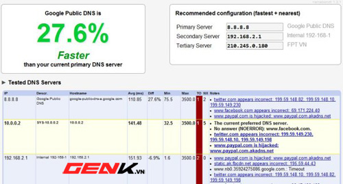 Kết thúc quá trình, ứng dụng sẽ đánh giá sự cải thiện tốc độ mạng của bạn khi thay đổi máy chủ DNS. Bên cạnh đó Namebench cũng cho bạn biết máy chủ DNS có tốc độ nhanh nhất mà ứng dụng tìm được. Bạn hãy ghi lại hai địa chỉ IP ở hai mục Primary Server và Secondary Server.
