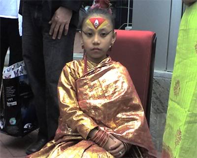 Qua ô cửa sổ nhỏ của ngôi đền, một cô bé gái khoảng chừng 4 tuổi xuất hiện trong bộ trang phục màu đỏ với tóc vấn cao cùng nhiều trang sức và một con mắt thứ ba được vẽ trên trán vô cùng huyền bí. Nữ thần có vẻ mặt hơi buồn, thờ ơ đưa mắt nhìn tất cả mọi người. Toàn thể dân chúng Nepal có mặt tại ngôi đền khi đó vội vàng quỳ rạp người, thành kính lạy lục và khấn vái.