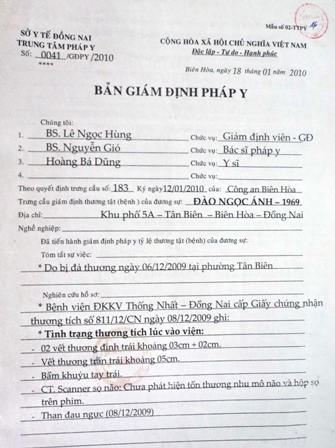 Tôi cho rằng kết quả GĐPY trong vụ án này cần phải được xem xét lại một cách khách quan, nhất là kết quả giám định của Trung tâm pháp y (TTPY) tỉnh Đồng Nai. Bởi kết quả của Trung tâm này không b́nh thường, áp dụng mức tỷ lệ thương tật không phù hợp với Thông tư số 12 ngày 26/71995 của liên Bộ Y tế - Bộ LĐTB & XH (vết thương phần mềm nhưng lại áp dụng chương chấn thương vùng mặt gây biến dạng, ảnh hưởng đến chức năng nhai). Hơn nữa, vết thương trên trán của ông Ánh, theo giấy chứng nhận thương tích của BV đa khoa Thống Nhất ghi 3cm, nhưng kết quả giám định lại ghi là 5cm. Sự bất thường này khiến nhiều người ta nghi ngờ về tính khách quan kết quả giám định của TTPY Đồng Nai.