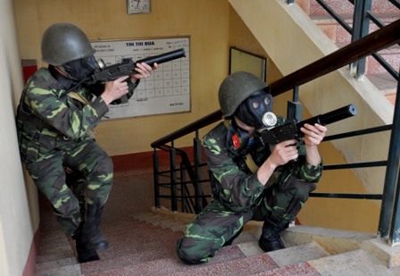 | Luyện tập phương án giải cứu con tin. Ảnh Hoàng Hải |