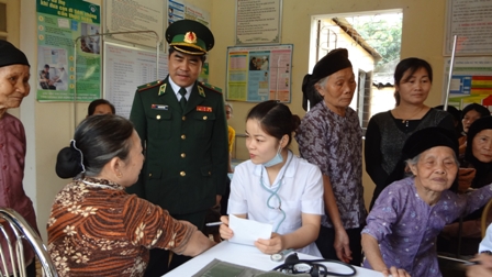 Theo chân Thiếu tướng Hoàng Văn Đồng- Chính ủy Học viện Biên pḥng - chúng tôi được hoà ḿnh vào đội h́nh của Học viện Biên pḥng trong đợt hành quân về xă lần này. Hết chứng kiến cảnh những bác sỹ, ư tá mang quân hàm xanh khám bệnh, cấp thuốc và tư vấn pḥng chống HIV-AIDS, thực hiện kế hoạch hóa gia đ́nh..cho nhân dân tại trạm y tế xă, chúng tôi lại về trụ sở UBND xă nghe các giảng viên của Học viện nói chuyện thời sự và phổ biến giáo dục pháp luật, pḥng chống tệ nạn xă hội và vi phạm pháp luật…