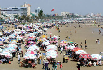 Băi biển Sầm Sơn (Thanh Hóa) đông nghẹt du khách. Đây là một trong những "điểm đen" du lịch v́ t́nh trạng chặt chém diễn ra tràn lan (Ảnh: Tuoitre)
