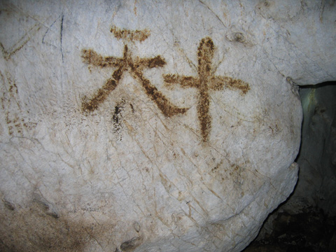 Ở ngách bên cạnh, cách mộ thân cây khoảng hơn 20m là một vách đá dựng chắn lối đi, có hai chữ "Thiên thập" viết bằng chữ Hán ở tầm vừa tay với người lớn. Cạnh đó là hình một tam giác có một đỉnh quay xuống dưới. Phía dưới nền hang đã bị đào nham nhở, dấu hiệu đã có người đào bới.