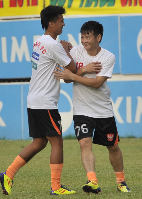 | Nụ cười đă trở lại với Văn Quyến (phải) dù anh vẫn c̣n ngồi ghế dự bị của Sài G̣n FC - Ảnh: S.H. |