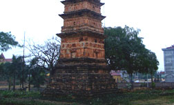 Đứng từ xa nhìn lại, cao vọt khỏi ngọn tre là tòa tháp xây gạch đỏ au trong bóng chiều. Sư cô Thích Bửu Đạo cặm cụi nhổ cỏ dưới chân tháp. Thật cám cảnh khi nhìn tòa tháp cổ kính, đẹp đẽ lại lọt giữa một không gian bừa bộn, hoang tàn đến vậy.
