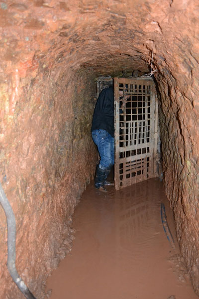 Chúng tôi phải mang theo ủng, đèn pin vì nước và bùn đỏ từ trong địa đạo ào ào chảy ra. Bì bõm trong bóng tối, chúng tôi lách người qua một khe cửa sắt. Sát cánh cửa có cầu dao và hệ thống dây điện chằng chịt. Rọi đèn pin thấy 4 xe rùa (chở quặng thiếc) nối đuôi nhau hướng ra cửa địa đạo.