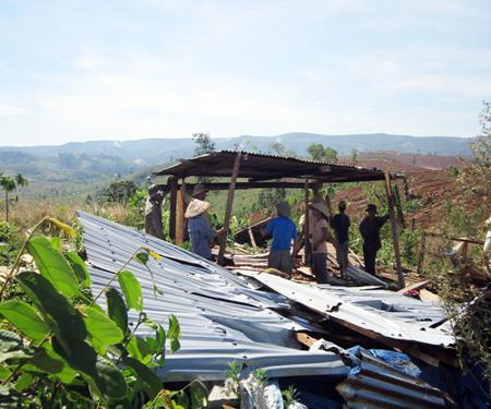 Lúc chúng tôi đến, một đoàn cưỡng chế chừng 50 người đang “bao vây” túp lều nhỏ của anh Lâm Văn Nhâm cùng người mẹ mù 75 tuổi. Hai mẹ con anh Nhâm có khoảng 3 héc ta điều trồng từ năm 2005 vừa bị cưỡng chế, thu hồi trắng. Do ngôi nhà nhỏ dựng ngay trên đất rẫy đã bị ủi sập, không có chỗ ở nên anh Nhâm dựng túp lều cho mẹ trú tạm, nhưng ngày nào lực lượng “hậu” cưỡng chế cũng vào yêu cầu mẹ con anh dọn đi. “Bữa giờ 2 mẹ con bả bị đuổi hoài. Cứ dựng lều lên là bị kéo sập xuống. Tội lắm. Từ hôm qua đến giờ bả chưa có gì trong bụng, tụi tôi mua cháo mang đến cho bả ăn mà mấy ổng canh bên ngoài không cho vào”.