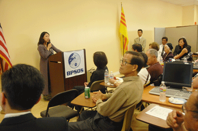 Quang cảnh buổi tái khai trương văn pḥng chi nhánh BPSOS trong khu thương xá Catinat Plaza, Westminster, hôm Thứ Năm vừa qua. BPSOS sẽ có một buổi nói chuyện về người Việt tị nạn ở Thái Lan và tệ nạn buôn người, tổ chức tại pḥng sinh hoạt nhật báo Người Việt. (H́nh: Đỗ Dzũng/Người Việt)
