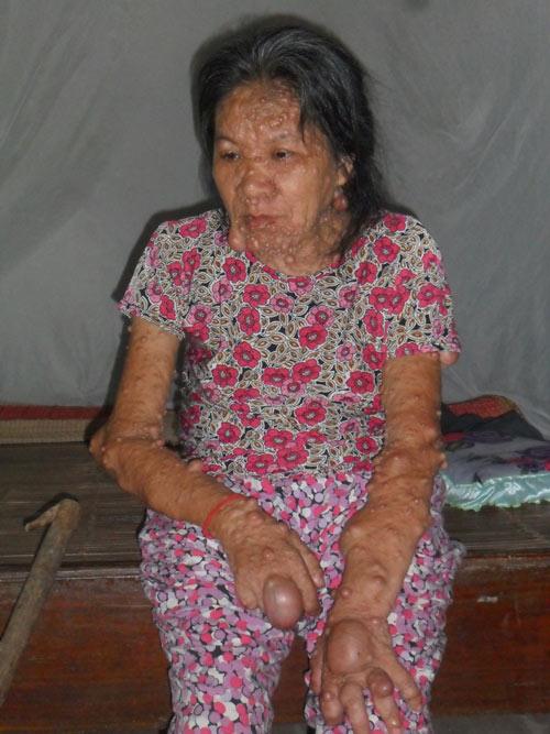 - Rùng mình nhưng đầy nỗi thương cảm là cảm nhận đầu tiên khi chúng tôi gặp người đàn bà ấy. Khắp cơ thể bà, từ chân tay đến mặt mũi nổi đầy những nốt, khối u sần sùi to nhỏ. Đã 53 năm trôi qua bà phải mang “thân hình của con quỷ”.