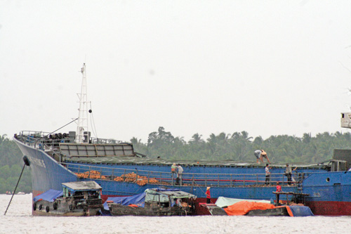 Một tàu đang bốc dừa trên sông Hàm Luông xuất sang Trung Quốc - Ảnh: Tiến Tŕnh |