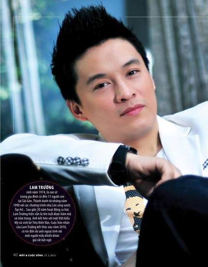 Khi anh yêu hay chọn vợ, ba má anh cũng không can thiệp mà để anh tự quyết định lấy. Ba má chỉ dặn ḍ, khi đă chọn th́ sau này phải chịu trách nhiệm với cuộc đời ḿnh. Đến giờ Lam Trường vẫn chưa nghĩ đến chuyện sẽ tái hôn, anh vẫn thấy c̣n hơi… sớm và anh tin vào duyên số chứ không phải cố để t́m.