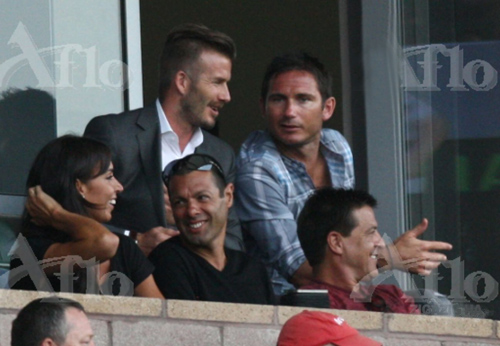 Becks cười 'tít mắt' xem bóng đá cùng Lampard