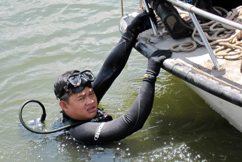 Theo Tuấn, nếu ở trên cạn phải trực tiếp cầm "ṿi rồng" vào tận đám cháy để cứu người th́ dưới nước cái khó là phải cảm nhận bằng chân và tay. Nếu không may sẽ đối mặt với nhiều nguy hiểm như gặp phải các chai lọ thủy tinh hoặc những vật sắc nhọn.