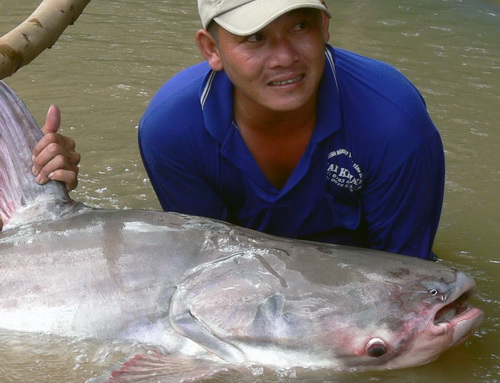 Dùng ghe lớn đưa cá tra dầu khổng lồ về trại giống