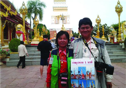 Hai anh em chị Nguyễn Thị Bé và Nguyễn Văn Diêm chụp ảnh dạo ở Wat Phra That Phanom - Ảnh: B.N.L