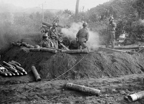 | Một khẩu đội pháo của Mỹ bắn về phía lực lượng Triều Tiên ngày 10/7/1950. |
