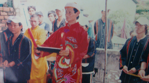 Ông Ba Oanh (áo đỏ) cùng đội từ thiện đang hành lễ.