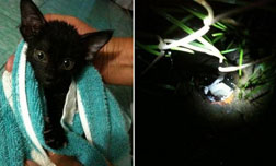 Vì hố nằm bên trong rào chắn B40, nên một mình mình không thể làm được gì vì mình không có sức vừa đẩy và giữ lưới quá lâu (mẹ thì phải đứng giữ vì phải nổ máy xe cho có thêm đèn sáng). May sao lúc đó có một anh đi bộ đi ngang, nhìn nhìn, hỏi hỏi, mình nhờ luôn. Ảnh dùng sức đẩy và giữ lưới, mình dùng tay bạt cỏ ra và rọi đèn pin xuống hố. Nước đen thui. Một cảnh tượng hãi hùng (đối với mình): bé mèo chỉ còn ló được cái miệng và 2 con mắt lên khỏi mặt nước, chân bám vào một cái hộp xốp, lâu lâu em bị chìm, rồi lại vùng vẫy ngoi lên thở, rồi lại chìm... Không có cách gì có thể với tới bé được. Sâu quá. Anh thanh niên sau khi quan sát, nhìn mình lắc đầu: "không cứu được đâu, sâu lắm”. Mình dứt khoát: "em đã nói là được mà!" (Tuy nói vậy, nhưng lúc đó mình cũng chẳng biết là dựa vào đâu mà mình nói vậy nữa, và thật ra là mình gần như...sắp khóc vì cái gì không biết nữa).