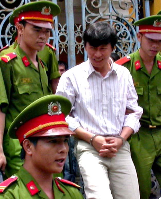 Nhà báo Hoàng Khương cùng các bị cáo tại phiên xử. Ảnh: Phùng Bắc