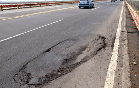 | Dù đă được sửa chữa, vá víu lại nhiều lần nhưng đến nay mặt cầu Thăng Long vẫn đang tiếp tục nứt. Ảnh: Xuân Tùng | Chỉ có thể sửa chữa triệt để sau khi thông xe cầu Nhật Tân