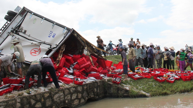 Xe tải lật, 8 tấn cá ngừ đổ tràn ra ruộng