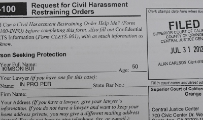 Ðơn của bà KimSon Bui xin lệnh cách ly 100 yard đối với ông Apolinar Leon. (Hình: Dân Huỳnh/Người Việt)