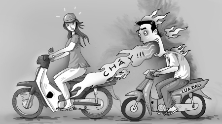 Sáng 9-11, chị M. (23 tuổi, tạm trú Q.3) chạy xe trên xa lộ Hà Nội đoạn gần trạm thu phí (Q.9) thì bất ngờ một người đàn ông chạy xe song song nói lớn: “Xe cháy kìa em”. Chị M. kiểm tra nhưng không thấy dấu hiệu xe cháy nên tiếp tục chạy. Đến gần ngã tư Bình Thái, một thanh niên khác chạy xe từ phía sau vọt lên nói lớn: “Xe chị cháy kìa”. Chị M. phát hoảng tấp xe vô lề, người thanh niên cũng đi theo nói kiểm tra giúp. Hí hoáy chiếc xe một lúc, người này nói phải thay bugi và “tự nguyện” mang ra thay rồi đòi chị M. đưa 300.000 đồng.