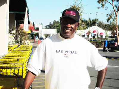 Vui nghề, yêu đời với công việc đẩy xe trong khu chợ Saigon City Supermarket. (H́nh: Huy Phương/Người Việt)