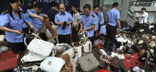 Nhân viên quản lư doanh nghiệp Trung Quốc cắt các túi xách Louis Vuitton giả trong một chiến dịch lùng bắt loạt hàng Louis Vuitton giả hiệu tại thành phố Trùng Khánh, phía Tây Nam Trung Quốc, vào Tháng Tám, 2010. (H́nh: AP Photo)