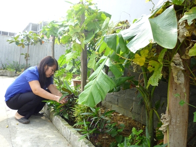Chị Ngô Thị Cẩm chăm sóc vườn rau nhỏ bên cạnh chung cư. Ảnh: Hoàng Ny.