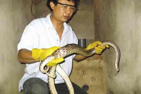 Tôi sợ hãi không dám chui tiếp vào bên trong nhà rắn. Những cái đầu rắn lúc ngửng cao, lúc rụt thấp, những cái lưỡi chẻ đôi cứ chớp lia lịa, phát khiếp. Thế mà anh An vẫn cứ chúi mặt vào nó, ve vuốt một lượt hết con này đến con khác. Cả mấy con rắn ngoan ngoãn lim dim mắt, y như đang được nghe hát ru để đi vào giấc ngủ. Anh kể: “Hễ nghe tiếng bước chân của mình vào chuồng thì cả bọn lại chui từ trong hang ra, để… chào. Người khác thì đừng hòng, dù có làm cách gì nó vẫn cứ cố thủ”.