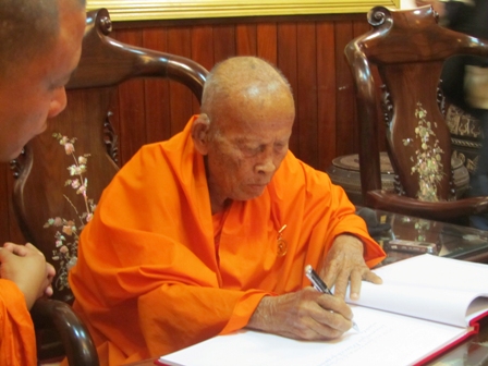 | Dù tuổi cao nhưng Hòa thượng Phoong Xả Ma Lợt từ chối lời đề nghị viết hộ, mà tự tay mình viết vào cuốn sổ lưu niệm. |