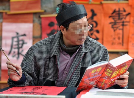 Thấy có mấy gian đông hơn hẳn những gian khác, người bạn kéo tôi lại gần xem. Tới gian của một cụ đã cao tuổi, ước chừng 60- 70, nét mặt phúc hậu, râu tóc đạo mạo. Một người phụ nữ đang nhờ cụ cho một chữ để đứa con gái đầu lòng được khoẻ mạnh. Cụ đồ mới lôi một quyển sách cũ ra, lật từng trang một, không có chữ cần tìm, cụ bèn lôi từ dưới gầm chõng ra một… quyển từ điển Hán Việt dày cộp để tìm. Thấy chừng người phụ nữ trẻ có vẻ sốt ruột, cụ mới trấn an bằng cách hỏi thêm thông tin giờ sinh của em bé, tay vẫn lật từng trang một.