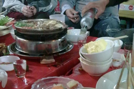Mặt búng ra sữa, Hùng rót rượu khá… sành sỏi. Nhìn qua, ít ai nghĩ rằng Hùng đã làm "bạn với rượu" hơn 3 năm nay. Sau khi các món đồ nướng: lòng, dạ dày lợn, nầm, thịt bò… đã được cô nhân viên phục vụ bưng ra, cử chỉ cụng ly, kèm với đó là tiếng "1, 2, 3 dzô…2, 3 dzô…" cứ thế phát ra từ 5 thành viên trong nhóm Hùng. Và tất nhiên lúc này chai rượu Vodka Men (loại to) ngày một vơi dần. Tận mắt chứng kiến cảnh uống rượu như nước lã, loáng một cái đã hết 3 chai của nhóm Hùng, tôi thấy hoảng, bởi sức trẻ của nhóm Hùng cũng như các bạn trẻ ngồi nhậu xung quanh đang bị phung phí theo những cuộc vui phản khoa học này.