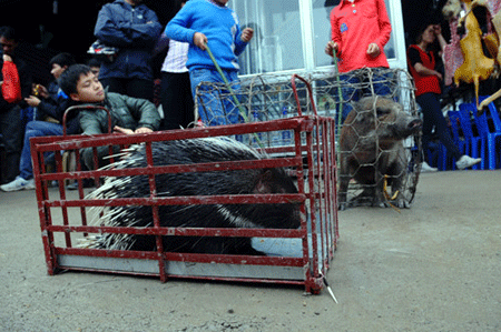 Theo Trưởng Ban tổ chức lễ hội chùa Hương, thịt lợn rừng và nhím rừng được bày bán tại lễ hội năm nay được nuôi sinh sản trong dân. Ảnh: VnE